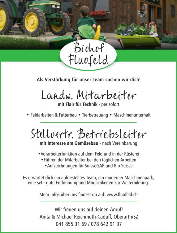 Zur Ergänzung unseres Teams suchen wir einen Landwirt EFZ. Du bist für den Futterbau und für unsere Tiere (Hühner / Rinder) zuständig. Ebenfalls bist du Herr über unseren Maschinenpark. Traktoren von klein bis gross, Hubstapler, Teleskoplader müssen gefahren und gewartet werden. Auch dieser Bereich gehört zu deinem Aufgabengebiet.
