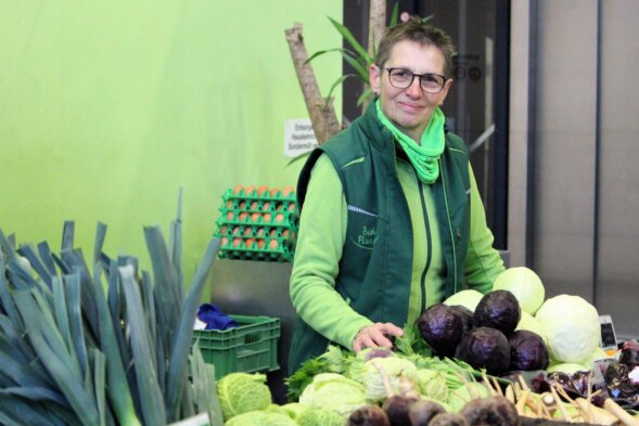 Als Verkäuferin gehört Sonja seit dem Herbst 2021 zum Team des Biohofs Fluofeld. Wie Michelle ist auch sie nicht nur Verkäuferin im Hofladen und auf den Märkten, sondern packt auch die Abotaschen ab.